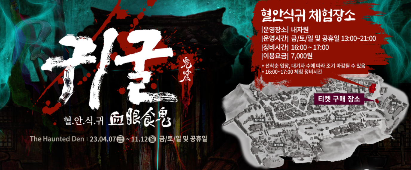 요즘 용인 데이트장소로 핫한 용인 한국민속촌 가보셨나요? 한국민속촌은 전통문화 테마파크로 다양한 전통문화와 전통가옥 등을 체험할 수 있어서 체험학습, 가족나들이, 데이트코스로도 유명한데요 요즘은 귀굴 공포체험이 핫하답니다. 다른 공포체험들 보다 더욱 실감나는 분장과 퀄리티로 호평을 받는 귀굴 공포체험 온라인예매와 현장발권 방법 알려드릴게요!