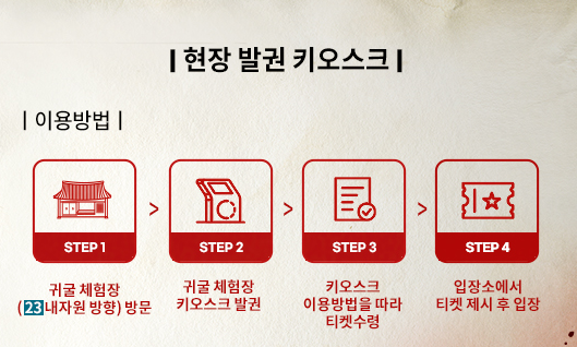 온라인예매가 매진되었다면 현장구매도 가능해요. 다만 현장 키오스크에서 발권이 되기 때문에 실시간으로 잔여티켓 수량은 파악하기 힘들다는 단점이 있어요. 때문에 귀굴 공포체험을 원하신다면 한국민속촌 입장과 동시에 귀굴 티켓 발권부터 하러 가셔야해요. 특히 일몰 후 늦은 시간대의 티켓은 경쟁이 치열하니 서두르셔야해요!