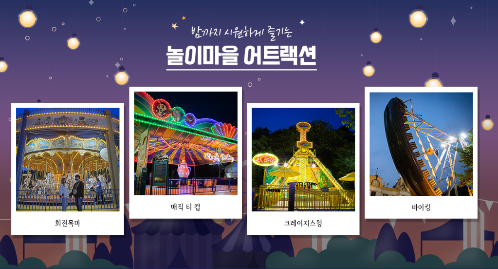 한국민속촌은 귀굴 체험 이외에도 다양한 즐길거리가 있어요. 다양한 체험활동과 이벤트도 진행되고 있고, 곳곳에 있는 포토스팟에서 시간보내기 참 좋아요. 요즘은 야간개장중이라 특별공연 연분도 관람하고, 놀이동산에서 야간 어트랙션도 즐길 수 있답니다!