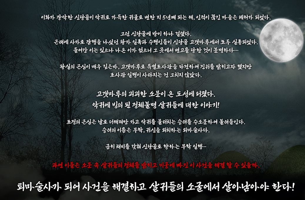 무당 이화가 장악한 신당골은 악귀로 가득한 귀굴로 변하게 된다. 왕가 일종과 수행인 들은 흔적도 없이 사라져 버렸고, 왕실에서 파견한 특별조사관들도 자취를 감춰버렸다. 이에 악귀를 물리치는 퇴마술사 무학을 불러들이게 되는데.. 당신은 무학과 함께 사건을 해결하고 살귀들의 소굴에서 살아남아야 한다.